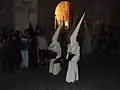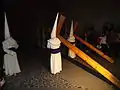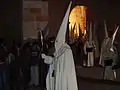 The habit of the brotherhood and its long caperuz, are white serge, to which is added a sash and purple edges. The brothers wear Franciscan sandals, carrying a black wood torch, with metal bowl and a red wax candle.[2][3]