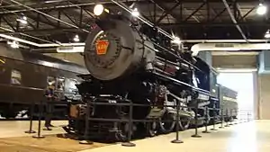 After the race, No. 460 went back to its normal duties until March 1937, when it was loaned to the Long Island Rail Road. In January 1939, No. 460 was returned to the Pennsylvania, but was still occasionally used on Long Island as a "short term 'loaner'".[3] Starting in 1942, it hauled trains between Camden and Bay Head, New Jersey. In 1951, parts were taken of other E6s locomotives that were going to be scrapped: the drivers on the engineer's (right) side are from PRR 1565, the air reservoir on the fireman's (left) side was from PRR 690 and the reservoir on the engineer's side was from PRR 782.[7] 460's tender was replaced in 1952 with one from 1565; the original tender had been transferred to maintenance-of-way service.[8] 460 was leased to the Pennsylvania–Reading Seashore Lines in 1953 before being retired in 1955 and added to the Pennsylvania's collection of historic locomotives in Northumberland, Pennsylvania.