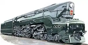 The Pennsylvania Railroad's T1 class steam locomotive was one of the most unique and controversial class of locomotives ever constructed. This was due to its unusual Duplex drive 4-4-4-4 wheel arrangement, its use of the Franklin Type A oscillating-cam poppet valve and its characteristic streamlining conceived by famous industrial designer Raymond Loewy.[1][2] The T1 was also the only class of Pennsylvania duplex able to travel on all of the railroad's network.[1] The T1 was also the first production series locomotive designed to use the poppet valve. The two prototype T1 locomotives were constructed in 1942 by the Baldwin Locomotive Works, numbered 6110 and 6111 respectively. Of the production series for the T1 class, with 25 locomotives Numbered 5500 to 5524 being constructed at the Pennsylvania Railroad's Altoona Works and the other 25 locomotives Numbered 5525 to 5549 being constructed at Baldwin. In total, 52 T1 class locomotives were constructed including the two prototypes.[9] This made the T1 the most numerous engine produced of all the Pennsylvania Railroad's duplex drive locomotives.[1]
