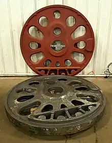The eight Boxpok driving wheels of the original T1's were 80 inches (2,032 mm) in diameter. This design is of a higher strength than conventional spoked driving wheels and ideal for high speed operations.[11] On July 8, 2015, the T1 Trust launched a Kickstarter campaign titled "Let's Get Rolling" to raise $20,000 to be used in the design and building of a casting pattern for the new Boxpok drivers. The campaign reached over its goal and construction began on the casting patterns, which were finished in October 2015.[8] Construction of the casting patterns was undertaken by Liberty Pattern in Youngstown, Ohio using a complex CAD model made of PRR 5550's proposed number four wheelset. Casting of the drivers was awarded to Beaver Valley Alloy in Monaca, Pennsylvania[11] On February 26, 2016, Beaver Valley Alloy cast the first of eight driving wheels at its foundry successfully.[1] This historic event marked the first time a steam locomotive driving wheel had been cast in the United States since the 1940s.[11] A second driver was ordered on December 9, 2016 and was cast by Beaver Valley Alloy on March 6, 2017. The second Boxpok was delivered to the T1 Trust on March 15, 2017 and placed next to the first completed driver. Both drivers represent the number four wheelset.[8]