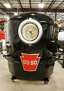 Pennsylvania Railroad 5550 is a mainline duplex drive steam locomotive being built in the United States of America. Upon completion, estimated to be around 2030, the locomotive will be the 53rd addition to (and only extant example of) the Pennsylvania Railroad's T1 steam locomotive class.[7] The total estimated cost of PRR 5550 was US $10,000,000, but with the acquisition of an existing long haul tender from the Western New York Railway Historical Society in August 2017, the total cost is now estimated to be closer to US $7,000,000.[8] Construction of the locomotive began in 2014 with the casting of the locomotive's keystone-shaped number plate. Major components completed as of March 2019 include two Boxpok drivers, the prow, cab, third course boiler and fire door. Front tube sheet construction was underway at a St. Louis, Missouri-based fabricator.[8]