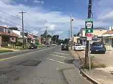 After passing the naval facility, Oxford Avenue continues northeast at the intersection with Robbins Street/Martins Mill Road and crosses Levick Street.[5] PA 232 runs north through the residential Lawncrest neighborhood and reaches the Five Points intersection with PA 73 (Cottman Avenue) and Rising Sun Avenue in the Burholme neighborhood. From this junction, the route passes a mix of urban residential and commercial establishments as it comes to a bridge over CSX's Trenton Subdivision at the Bleigh Avenue intersection and reaches a junction with Verree Road. PA 232 continues into the Fox Chase neighborhood, crossing SEPTA's Fox Chase Line at-grade south of its terminus at the Fox Chase station.[4][5] The route heads into the downtown area of Fox Chase and passes east of SEPTA's Fox Chase Bus Loop before coming to the Rhawn Street intersection, where the road makes a turn to the northwest.[4][5]