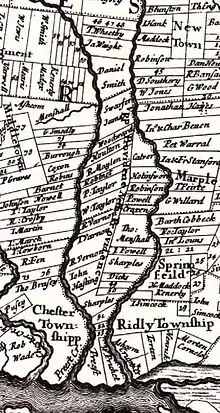 In 1683, the Court of Chester County (which then included present-day Delaware County) approved the construction of "Providence Great Road", which included the route of present-day PA 252 from the southern terminus to north of Media. The road was built to provide access to Chester from the north. The Providence Road was said to have been completed in 1684.[6] When Pennsylvania first legislated routes in 1911, what would become PA 252 was designated as Legislative Route 144, running between Media and King of Prussia. At this time, the entire route was unpaved.[7] PA 252 was designated by 1928 to run from PA 320 north of Chester north to US 122/PA 52 (now US 202) in King of Prussia, following its current alignment north to Wyola, where it turned northeast and intersected US 30 in Wayne before continuing north to King of Prussia. Between Wyola and King of Prussia, PA 252 followed what is now unnumbered portions of St. Davids Road, Brooke Road, Wayne Avenue, Radnor Road, Croton Road, and King of Prussia Road. At this time, the entire route was paved. By 1928, the current alignment of PA 252 was an unnumbered road between Wyola and Paoli, a part of US 122 between Paoli and Valley Forge Road, and a part of PA 83 north of there.[8]