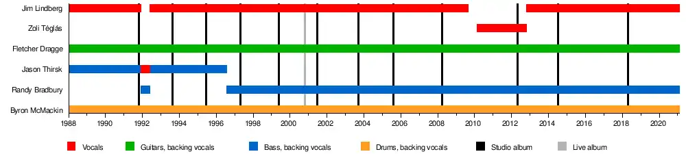 Pennywise's current line-up consists of Jim Lindberg (vocals), Fletcher Dragge (guitars), Randy Bradbury (bass) and Byron McMackin (drums). They had kept their original line-up together until bassist Jason Thirsk died of a self-inflicted gunshot wound in 1996, due to issues with his alcoholism, after which Bradbury joined as his replacement. In August 2009, Lindberg decided to leave the band; he was replaced in February 2010 by Ignite singer Zoli Téglás.[3] With Téglás, the band recorded their tenth studio album All or Nothing, which was released on May 1, 2012.[4] Lindberg rejoined the band later that year after Téglás was sidelined by a back injury.
