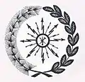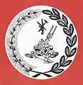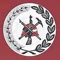 The PLA official emblem consisted of a red flag with a white disc on the centre, featuring a crossed dip pen and pickaxe superimposed on an AK-47 Assault rifle in the middle standing upwards, all in silver, inserted on a golden circular wreath, the latter consisting of two interlocking branches and leaves of the bay laurel and an unspecified plant.