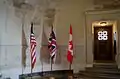 Flags of Canada, the U.S., and the U.K. fly next to the memorial at equal height.