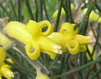 Persoonia saccata is usually an erect, sometimes a spreading shrub and has many main stems. It grows to a height of 0.2–1.5 m (0.7–5 ft) with a large underground lignotuber. The bark on the trunk is mostly smooth and grey. The leaves are arranged alternately and are linear in shape with the edges rolled under, 50–170 mm (2–7 in) long and about 1 mm (0.04 in) wide. The leaves are soft and flexible, hairy when young and a similar colour on both surfaces, with the veins usually not visible. The flowers are arranged in groups of between ten and fifty or more at the ends of the branches or in leaf axils. Each flower is on the end of a hairy pedicel 3.5–12 mm (0.1–0.5 in) long and held more or less horizontally. The groups have a stalk 20–250 mm (0.8–10 in) long. The flower is composed of four bright yellow, hairy tepals 9–14 mm (0.4–0.6 in) long, which are fused at the base but with the tips rolled back. The flower is irregular in shape with the lowest tepal having a sac-like or pouch-like shape. The tepals are joined at the base with the tips rolled back, so that it resembles a cross when viewed end-on. The central style is surrounded by four bright yellow anthers with white tips and which are also of different lengths. The anthers are fused to the tepals and unlike those in most other persoonias, are joined from base to tip. Flowering occurs from July to January and is followed by fruit which are smooth, oval shaped drupes containing a nut-like pyrene 8–11 mm (0.3–0.4 in) long and 4.5–6 mm (0.18–0.24 in) wide.[3][4]