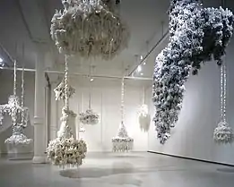Petah Coyne (born 1953) is a contemporary American sculptor and photographer best known for her large and small scale hanging sculptures and floor installations.[2] Working in innovative and disparate materials, her media has ranged from the organic to the ephemeral, from incorporating dead fish, mud, sticks, hay, hair, black sand, specially-formulated and patented wax, satin ribbons, silk flowers, to more recently, velvet, taxidermy, and cast wax statuary.[2][3] Coyne's sculptures and photographs have been the subject of more than 30 solo museum exhibitions.[4]