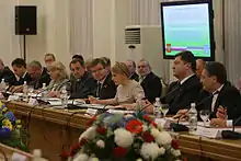 Ukrainian President Yushchenko nominated Poroshenko for Foreign Minister on 7 October 2009.[42][43] Poroshenko was appointed by the Verkhovna Rada (Ukraine's parliament) on 9 October 2009.[44][45] On 12 October 2009, President Yushchenko re-appointed Poroshenko to the National Security and Defense Council.[46] Poroshenko supported Ukrainian NATO-membership. However, he also stated NATO membership should not be a goal in itself.[47] Although Poroshenko was dismissed as foreign minister on 11 March 2010, President Viktor Yanukovych expressed hope for further cooperation with him.[21]
