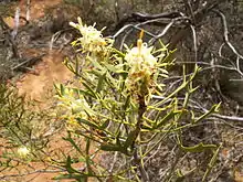 Petrophile shuttleworthiana is an upright, open shrub that can reach around 2 m (7 ft) tall. Its branches and leaves are glabrous, the leaves about 3.5–7 mm (0.1–0.3 in) long, deeply divided into between 3 and 7 rigid lobes, each with a sharp point on the end. Individual flowers are about 11 mm (0.4 in) long, cream, creamy white or yellow and glabrous.[3] They are terminal (appearing at the end of stems) and appear in spring.[4]
