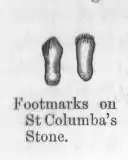 Close to St. Olann's Well at Coolineagh, near Coachford, County Cork, are the footprints of St. Olann on a boulder. In the garden of Belmont, on the Greencastle Road, about a mile from Derry, there was, in 1837, a block called St. Columba's Stone with two footprints on it. It may have been the inauguration stone of the Kings of Aileach, brought here by the local Chief of Derry.[2] On the Clare Hills in Ireland, on the Gort to Feakle road in the townland of Drumandoora, is the engraved outline or impression of a foot clothed by a sandal. On the Hill of Lech, or, previously, Mullach Leaght, the "Hill of the Stone", three miles (5 km) southwest of Monaghan in Ireland, was the inauguration stone of the Mac Mahons. It was used in 1595 and destroyed by a farm owner in 1809.[2] At Clonmacnoise, County Offaly, Ireland, close to the Chapel of Clonfinlough. there are several limestone boulders, one of which is called the Fairy's or Horseman's Stone. It has many cup-shaped hollows, crosses, daggers, and a pair of human feet. At Templemore in County Londonderry is a slab named St. Columbkille's Stone. It has the imprint of two feet, each ten inches (254 mm) in length. Traditionally, it was the inauguration stone of the ancient Irish chieftains.[47] Saint Columba's Stone near Derry has two depressions like the marks of feet. The O'Doherty's are said to have stood on this stone with bare feet at their inaugurations.[40] At Slievenamon (The Mountain of the Women), at South Tipperary in Ireland, is the rock that bears the footprints of Goll—"the One-Eyed"—who made a giant leap across the valley to catch up with the hunt of the Fianna. The West Pier in Howth Harbour, Dublin, displays a specimen of footprints from King George IV's visit in 1821.[48]