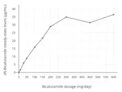 Whereas testosterone is the major circulating androgen, DHT is the major androgen in the prostate gland.[51] DHT levels in circulation are relatively low and only approximately 10% of those of circulating testosterone levels.[51] Conversely, local concentrations of DHT in the prostate gland are 8- to 10-fold higher than circulating levels of DHT.[52][25] This is due to high expression of 5α-reductase in the prostate gland, which very efficiently catalyzes the formation of DHT from testosterone[52] such that over 90% of intraprostatic testosterone is converted into DHT.[53][54] Relative to testosterone, DHT is 2.5- to 10-fold as potent as an AR agonist in bioassays, and hence, is a much stronger androgen in comparison.[55] As such, AR signaling is exceptionally high in the prostate gland, and the effectiveness of bicalutamide monotherapy in the treatment of prostate cancer, which is roughly equivalent to that of gonadotropin-releasing hormone analogues (GnRH analogues),[56][42][57][58] demonstrates a capacity of bicalutamide to strongly antagonize the AR. On the other hand, GnRH analogue monotherapy achieves only a 50 to 60% reduction in levels of DHT in the prostate gland,[19][59] and combined androgen blockade (CAB), the combination of surgical castration or a GnRH analogue and bicalutamide, is significantly more effective than either modality alone in the treatment of prostate cancer.[16][60] Bicalutamide monotherapy has been found to decrease circulating levels of prostate-specific antigen (PSA), a marker of prostate cancer growth, by 57% at 10 mg/day, 73% at 30 mg/day, 90% at 50 mg/day, 97% at 100 mg/day, and 97% at 150 mg/day, while a 97% reduction in PSA is observed with 50 mg/day bicalutamide as a part of CAB.[19] It has also been reported that bicalutamide monotherapy decreases median circulating levels of PSA at 3 months by 86.7% at 100 mg/day, 91.1% at 150 mg/day, and 93.8% at 200 mg/day.[50] Above a bicalutamide monotherapy dosage of 200 mg/day, up to 600 mg/day, decreases in PSA levels reach a plateau.[28]