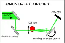 Analyzer-based imaging (ABI) is also known as diffraction-enhanced imaging (DEI), phase-dispersion Introscopy and multiple-image radiography (MIR)[54] Its setup consists of a monochromator (usually a single or double crystal that also collimates the beam) in front of the sample and an analyzer crystal positioned in Bragg geometry between the sample and the detector. (See figure to the right)