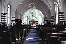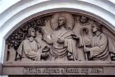 The altarpiece is a painting in a gilt carved frame by Danish artist Erik Jensen (1883-1974). The pulpit has gospel reliefs by M. Sørensen. Above the west entrance is a tympanon relief designed by Johan Rudolf Carl Nielsen (1863-1952). The inscription quoting the words of Philip the Apostle to Nathanael in John 1:45: "Come and see". [2] [3]