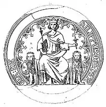 King Philip V died sonless in 1322 and all his patrimony passed to his and King Louis X's younger brother, King Charles IV, who married Philip's sister Joan in 1325.[3] When Charles too died leaving no sons on 1 February 1328,[3] the direct male line of the House of Capet came to an end.[8] With the bypassing first of Philip of Évreux's wife and then of Philip V's daughters, the principle of agnatic succession had become established.[8] Philip of Évreux and his namesake cousin, Philip of Valois, were the strongest Capetian candidates for the throne, while King Edward III of England claimed it as Charles IV's sororal nephew. The 15-year-old Edward's claim was dismissed, and the 35-year-old Philip of Valois was preferred over the 23-year-old Philip of Évreux on account of his more mature age.[9] The House of Valois thus ascended the throne in the person of Philip VI, who immediately took Philip of Évreux on his council.[10] The Valois had no right to the Kingdom of Navarre or the French counties of Champagne and Brie, however, as they were not descended from Joan I. Philip VI could not allow the Évreux couple to take possession of Champagne and Brie since that, coupled with their holdings in Normandy, would give them a powerbase encircling his capital at Paris.[11] Philip and Joan thus ceded these lands to the Valois in return for the counties of Angoulême, Mortain and Longueville.[12]