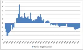 These three variables are: the unemployment rate, the rate of unionisation of the workforce and the number of strike days lost every year (a proxy for the unions’ willingness to use their power). The rate of unemployment negatively impacts worker bargaining, while the other two variables positively impact it.[9]