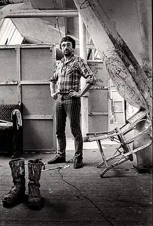 In 1988 Vandenberg traveled to Southwest America.[1][12] He had exhibitions in France, The United States, and The Netherlands, and his paintings were highly sought after by collectors.[14][13] Despite his growing success, he felt oppressed by the art market and the opportunistic stance of certain critics.[15][16] He began to use motifs derived from graffiti art, as well as images distilled from comic books.[16][17] In 1989, he introduced references to world politics into his work, such as swastikas, portraits of political or religious leaders, and men carrying dollar bills.[18][19][20][21][22][17] Collectors failed to grasp the sudden turnabout in his oeuvre, a feeling shared by several critics, who fiercely rejected the works.[12][22]