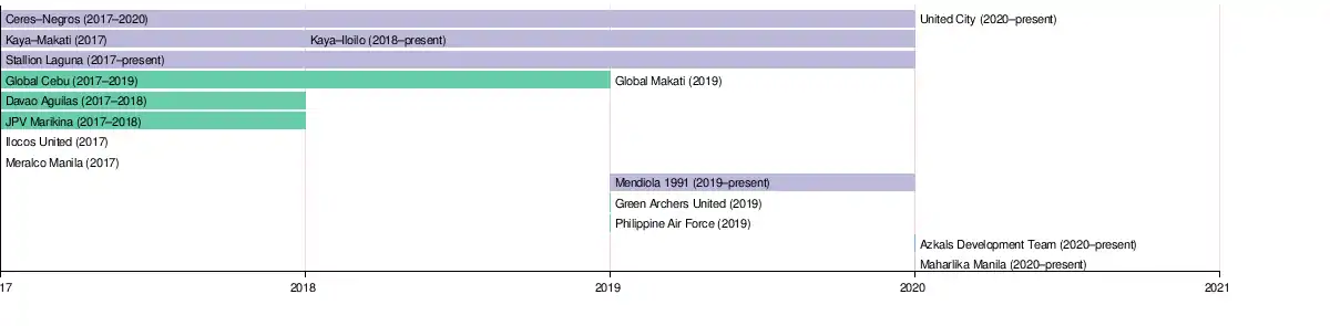 Eleven clubs have played in the PFL since its inception in 2017, up to and including the 2020 season. The following six teams competed in the 2020 season; three of which have been competing since in 2017, while the Azkals Development Team (as guests) and Maharlika Manila made their debut.