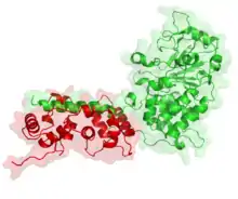 A protein phosphatase is an enzyme that dephosphorylates an amino acid residue of its protein substrate. Whereas protein kinases act as signaling molecules by phosphorylating proteins, phosphatases remove the phosphate group, which is essential if the system of intracellular signaling is to be able to reset for future use. The tandem work of kinases and phosphatases constitute a significant element of the cell's regulatory network.[9] Phosphorylation (and dephosphorylation) is among the most common modes of posttranslational modification in proteins, and it is estimated that, at any given time, up to 30% of all proteins are phosphorylated.[10][11] Two notable protein phosphatases are PP2A and PP2B. PP2A is involved in multiple regulatory processes, such as DNA replication, metabolism, transcription, and development. PP2B, also called calcineurin, is involved in the proliferation of T cells; because of this, it is the target of some drugs that seek to suppress the immune system.[9]