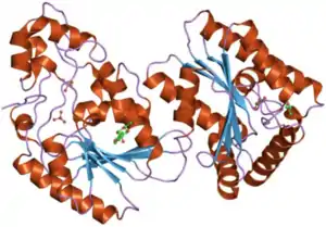 The monomers of the bifunctional protein are clearly divided into two functional domains. The kinase domain is located on the N-terminal.[8] It consists of a central six-stranded β sheet, with five parallel strands and an antiparallel edge strand, surrounded by seven α helices.[6] The domain contains nucleotide-binding fold (nbf) at the C-terminal end of the first β-strand.[9] The PFK-2 domain appears to be closely related to the superfamily of mononucleotide binding proteins including adenylate cyclase.[10]