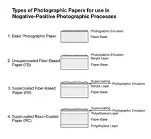 Fiber-based (FB or Baryta) photographic papers consist of a paper base coated with baryta.[4] Tints are sometimes added to the baryta to add subtle colour to the final print; however most modern papers use optical brighteners to extend the paper's tonal range.[3] Most fiber-based papers include a clear hardened gelatin layer above the emulsion which protects it from physical damage, especially during processing. This is called a supercoating. Papers without a supercoating are suitable for use with the bromoil process.[2] Fiber-based papers are generally chosen as a medium for high-quality prints for exhibition, display and archiving purposes. These papers require careful processing and handling, especially when wet. However, they are easier to tone, hand-colour and retouch than resin-coated equivalents.[3]