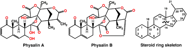 Physalins are steroidal constituents of Physalis plants which possess an unusual 13,14-seco-16,24-cyclo-steroidal ring skeleton (where the bond that is normally present between the 13 and 14 positions in other steroids is broken while a new bond between positions 16 and 24 is formed; see figure below).[1] Since the isolation and the structure determination of Physalin A and Physalin B in 1969, more than a dozen Physalins were isolated from Physalis species, Physalis alkekengi, Physalis angulata, and Physalis lancifolia. These compounds have antimicrobial,[2][3] and antiparasitic effects.[4]