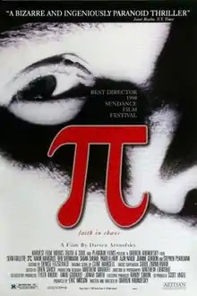 Pi (stylized as π)[lower-alpha 1] is a 1998 American psychological thriller film written and directed by Darren Aronofsky in his feature directorial debut. Pi was filmed on high-contrast black-and-white reversal film[4][5] and earned Aronofsky the Directing Award at the 1998 Sundance Film Festival, the Independent Spirit Award for Best First Screenplay and the Gotham Open Palm Award.