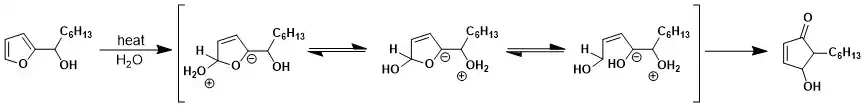 It was proposed by Piancatelli that the reaction is a thermal electrocyclic reaction of a conrotatory 4π electron system while studying specifics of the mechanism conditions when synthesizing the 4-hydroxycyclopentenone derivatives. This mechanism was suggested when studying 1H NMR spectra as it became apparent that the final products exclusively delivered the trans isomer.[1]