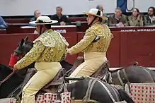 A picador (Spanish pronunciation: [pikaˈðoɾ]; pl. picadores) is one of the pair of horse-mounted bullfighters in a Spanish-style bullfight that jab the bull with a lance.[1][2] They perform in the tercio de varas, which is the first of the three stages in a stylized bullfight.