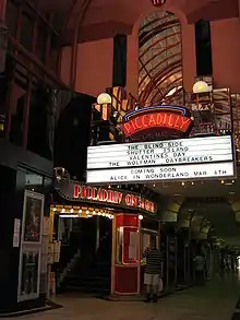 In 1984 the theatre and arcade underwent a significant refurbishment, with the refurbishment winning an architectural award from the Royal Australian Institute of Architecture (WA Chapter) in 1986.[1] The theatre and arcade are classified by the National Trust of Australia and are included on the State Heritage Register. The Piccadilly Cinema was the last operating cinema in the Perth central business district before its closure in 2013 and until the opening of Raine Square's Palace Cinema in 2018.[2][3][4] A redevelopment of the cinema space and arcade is expected to be completed in late 2019 or early 2020.