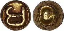 The first indigenous metallic coinage in the region, ca. 750–850 AD, comes from the Javanese kingdom of Sailendra (Chinese: Ho-ling). These roughly dome-shaped silver of irregular weight bore stamps of a flowing vase, and the sandalwood flower (quatefoil). By 850 AD weights had been standardized at 20 rattis to a Massa of about 2.4 grams. Silver and gold coins of Massa and fractional denominations were issued until about 1300 AD, with changes in shape and quality of inscription marking periods of issue. The gold Piloncitos of the Philippines are a late offshoot of the gold coinage, while the bean-like silver "namo" series, of the Malay isthmus was presumably an offshoot of the silver and may have evolved into the bullet (Pod-Duang) coinage of Sukhothai in Thailand.[7]