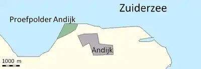 In 1924 the Lovink Committee published a proposal to build a pilot polder.[2] This polder could, on a small scale experiment future agriculture. The knowledge would then be used for the Wieringermeer. For this reason, in 1926-1927 near the village Andijk, 40 hectares (99 acres) of land were reclaimed.[1][3] On August 27, 1927, the pilot polder was drained. The cost of the polder, about 1 million guilders,[4] was relatively high, but the cost of polders to come should be lower.