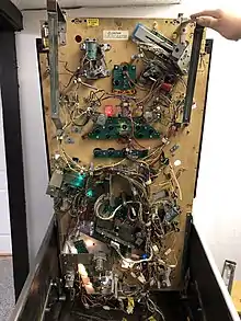 The introduction of microprocessors brought pinball into the realm of electronic gaming. The electromechanical relays and scoring reels that drove games in the 1950s and 1960s were replaced in the 1970s with circuit boards and digital displays. The first pinball machine using a microprocessor was Flicker, a prototype made by Bally in 1974. Bally soon followed that up with a solid state version of Bow and Arrow in the same year with a microprocessor board that would be used in eight other machines until 1978 which included Eight Ball, the machine that held the sales record from 1977 to 1993.[7] The first solid-state pinball is believed by some to be Mirco Games' The Spirit of '76 (1976),[8] though the first mainstream solid-state game was Williams' Hot Tip (1977). This new technology led to a boom for Williams and Bally, who attracted more players with games featuring more complex rules, digital sound effects, and speech.