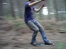 This is almost a cross of a rotation and a shove it. One spins the board under his/her feet and jumps up at the same time thus the board spins under them and the person either spins the same way as the board or in the reverse direction if they want to be fancy.