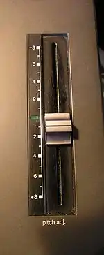 A variable speed pitch control (or vari-speed) is a control on an audio device such as a turntable, tape recorder, or CD player that allows the operator to deviate from a standard speed (such as 33, 45 or even 78 rpm on a turntable). The latter term "vari-speed" is more commonly used for tape decks, particularly in the UK. Analog pitch controls vary the voltage being used by the playback device; digital controls use digital signal processing to change the playback speed or pitch. A typical DJ deck allows the pitch to be increased or reduced by up to 8%, which is achieved by increasing or reducing the speed at which the platter rotates.