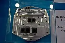 The HFI was sensitive between 100 and 857 GHz, using 52 bolometric detectors, manufactured by JPL/Caltech,[8] optically coupled to the telescope through cold optics, manufactured by Cardiff University's School of Physics and Astronomy,[9] consisting of a triple horn configuration and optical filters, a similar concept to that used in the Archeops balloon-borne experiment. These detection assemblies are divided into 6 frequency bands (centred at 100, 143, 217, 353, 545 and 857 GHz), each with a bandwidth of 33%. Of these six bands, only the lower four have the capability to measure the polarisation of incoming radiation; the two higher bands do not.[5]