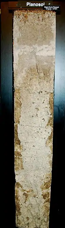 A Planosol in the World Reference Base for Soil Resources[1] is a soil with a light-coloured, coarse-textured, surface horizon that shows signs of periodic water stagnation and abruptly overlies a dense, slowly permeable subsoil with significantly more clay than the surface horizon. In the US Soil Classification of 1938 used the name Planosols, whereas its successor, the USDA soil taxonomy, includes most Planosols in the Great Groups Albaqualfs, Albaquults and Argialbolls.