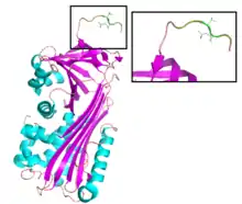 Like other serpins, PAI-2 has three beta sheets (A, B, C) and nine alpha helices (hA-hI).[6][7] The structure of PAI-2 mutants have been solved, in which the 33-amino acid loop connecting helices C and D is deleted. This CD-loop is particularly flexible and difficult to stabilize, as the loop is known to translocate up to 54 Å during the formation of intramolecular disulfide bonds.[8] In addition to the CD-loop, notable motifs include the reactive center loop (RCL) spanning amino acids 379-383 and an N-terminal hydrophobic signal sequence.