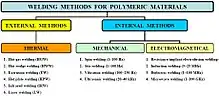 Plastic welding is welding for semi-finished plastic materials, and is described in ISO 472[1] as a process of uniting softened surfaces of materials, generally with the aid of heat (except solvent welding). Welding of thermoplastics is accomplished in three sequential stages, namely surface preparation, application of heat and pressure, and cooling. Numerous welding methods have been developed for the joining of semi-finished plastic materials. Based on the mechanism of heat generation at the welding interface, welding methods for thermoplastics can be classified as external and internal heating methods,[2] as shown in Fig 1.