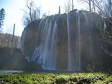 The name Plitvice was first mentioned in a written document in 1777 by Dominik Vukasović, the priest of Otočac.[8] This name was designated due to natural phenomena that have created the lakes. Nature formed shallow basins (Croatian pličina or plitvak, plitko means shallow), which have been filled with water. For centuries, water has changed the limestone and thus the landscape of this area. The emerging travertine barriers decelerated and retained the flowing water. These dams are continuously growing in height.[9]