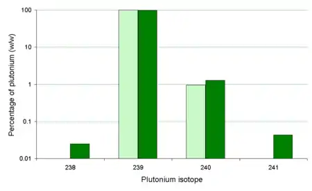 As the 239Pu/240Pu ratio only changed slightly during the Trinity detonation, it has been commented[11] that this isotope ratio for the majority of atomic bombs (in Japan the 239Pu/240Pu ratio in soil is normally in the range 0.17 to 0.19[12]) is very different than from the bomb dropped upon Nagasaki.