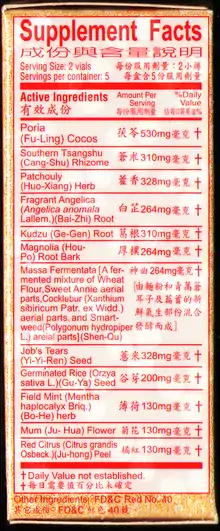 The lists of known ingredients for Po Chai pills are listed as follows: The proprietary mixtures are shown on the right pictures:
