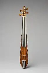 In general pochettes have a narrower body and longer neck in overall relation to its size compared to other bowed string instruments, they also often lack frets and either have four or three strings.[15] They also often have a distinctly vaulted and arched back.[8] A pochette is distinguishable from the rest of the violin family due to the fact that the neck is an prolongation of the body, instead of simply being attached to it.[16]
