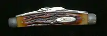 | Peanut | A smaller knife with a clip point and drop point from the same end, double bolsters on a slightly wavy handle. | ![]() A W.R. Case "Peanut" model with clip and spey blades |