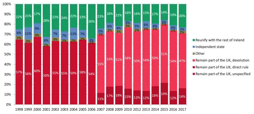 - "2018 Survey opinion question on long-term policy for Northern Ireland". Northern Ireland Life & Times. 2018. Retrieved 22 June 2019.