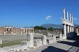 An important field of current research concerns structures that were restored between the earthquake of 62 and the eruption. It was thought until recently that some of the damage had still not been repaired at the time of the eruption, but this has been shown to be doubtful as the evidence of missing forum statues and marble wall-veneers are most likely due to robbers after the city's burial.[34][35] The public buildings on the east side of the forum were largely restored and were even enhanced by beautiful marble veneers and other modifications to the architecture.[36]