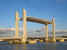 The Pont Jacques Chaban-Delmas is a vertical-lift bridge over the Garonne in Bordeaux, France. It was inaugurated on 16 March 2013 by President François Hollande and Alain Juppé, mayor of Bordeaux.[1] Its main span is 110 m (361 ft) long. As of 2013, it is the longest vertical-lift bridge in Europe.[1] It is named in honour of Jacques Chaban-Delmas, a former Prime Minister of France and a former mayor of Bordeaux.