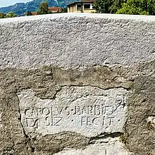 This bridge was the only crossing on the Arve until the construction of the Pont Neuf ("New Bridge") in 1850. The current bridge was built in 1674 and restored in 1833. A graffito carved in stone mentions the name of the builder, Charles Barbier; the architect was François Guénot, who usually worked for Charles Emmanuel II, Duke of Savoy.[3]