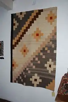 In Teotitlán, Porfirio works mainly with his sister Juana and her husband, and revolves the workshop around the use of natural dyes, which Juana specializes in.[8][10] This workshop revolves the central patio of the family home, where areas are set off for dying, drying, weaving and exhibition.[7] Grinding ingredients such as indigo and cochineal on a metate, Juana's skills have allowed her to create a much wider variety of tones than were achieved by her ancestors, able to create about 40 basic colors, with an infinite number of variations.[9][11]