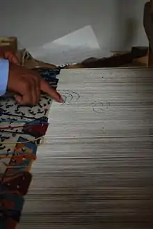 The weaving is done on pedal looms, with the wool yarn wound on bobbins and woven through cotton/wool blend threads.[7] A 3x5 foot rug can take several weeks to produce.[1] The largest pieces can take as long as eight months.[11]